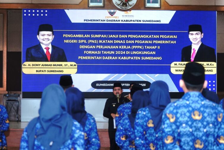 “Sumpah yang saudara ucapkan bukan formalitas, tapi ikrar moral dengan negara, rakyat, dan Allah SWT. Karena itu, jadilah ASN yang hadir sebagai bagian dari solusi, bukan bagian dari masalah,” tegas Bupati Dony Ahmad Munir saat memberikan arahan pada pelantikan 59 Aparatur Sipil Negara (ASN) yang terdiri dari 4 CPNS Ikatan Dinas dan 55 PPPK Tahap II Formasi 2024 di Aula Tampomas Setda Kabupaten Sumedang, Senin (1/9/2025).