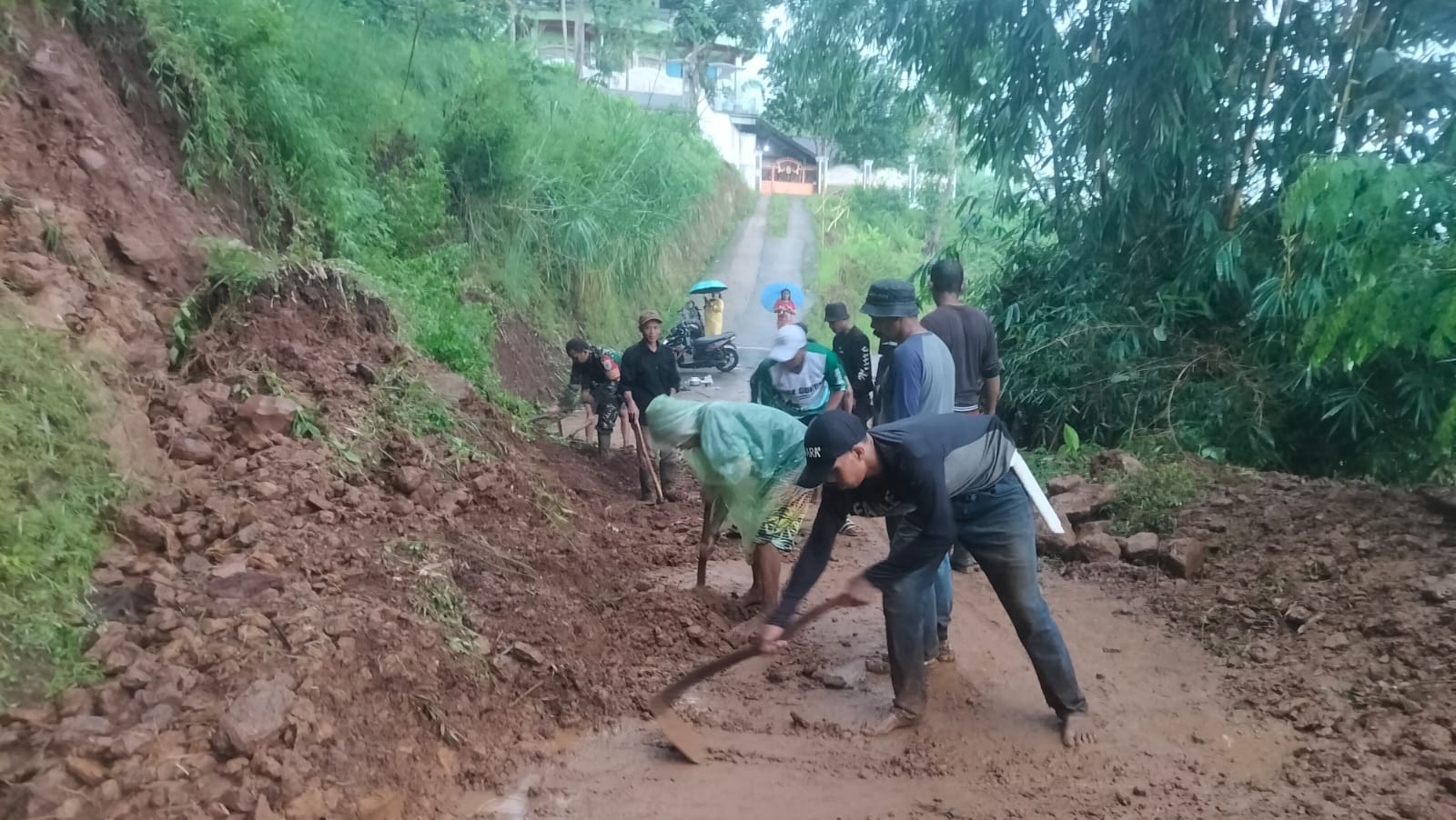 Longsor dengan lebar sekitar lima meter itu sempat memutus akses jalan warga. Material tanah dan bebatuan menutup sebagian ruas jalan, membuat aktivitas masyarakat terhambat. Namun, semangat gotong royong segera menyala. Babinsa bersama Kepala Dusun 3, para Ketua RW, perangkat desa, dan warga setempat bahu-membahu melakukan kerja bakti membersihkan material longsoran.