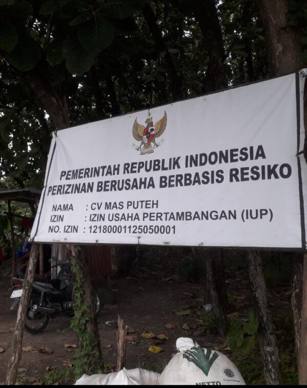 Di lokasi, terpasang papan bertuliskan Pemerintah Republik Indonesia – Perizinan Berusaha Berbasis Risiko atas nama CV Mas Puteh dengan jenis izin Izin Usaha Pertambangan (IUP).