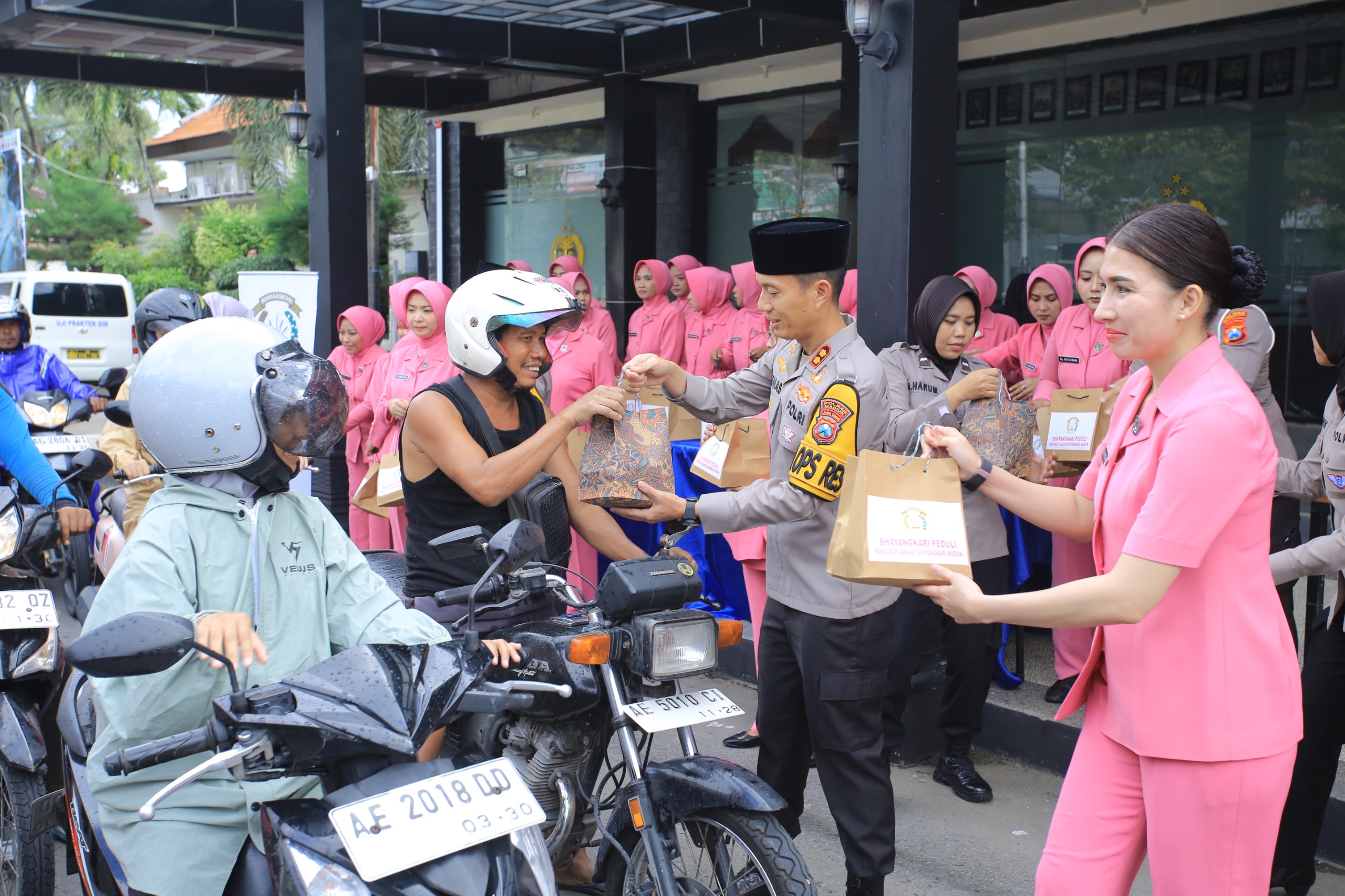 Kegiatan bakti sosial ini dipusatkan di area depan Halaman Mapolres Madiun. Dengan senyum ramah, Kapolres beserta jajaran pengurus Bhayangkari menghampiri para pengendara motor, pengemudi mobil, hingga pejalan kaki yang melintas menjelang waktu berbuka puasa.