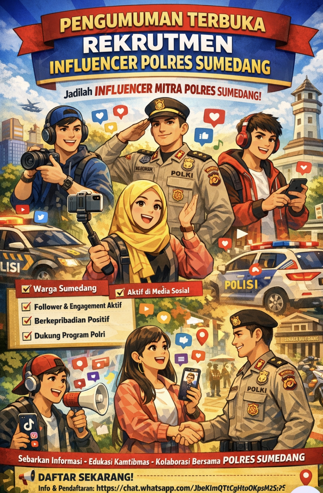 ‎Para influencer yang terpilih nantinya akan berperan membantu menyebarluaskan informasi kegiatan kepolisian, mengedukasi masyarakat soal keamanan dan pelayanan publik, hingga menjadi jembatan komunikasi antara Polri dan generasi muda. Syaratnya sederhana namun tegas: warga Sumedang, memiliki pengikut aktif dengan engagement baik, berkepribadian positif, serta tidak pernah terlibat tindak pidana.