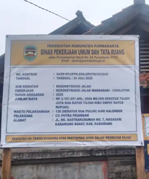 Purwakarta –Proyek rekonstruksi ruas jalan Margasari-Cikolotok yang dilaksanakan oleh Dinas Pekerjaan Umum dan Tata Ruang (PUTR) Kabupaten Purwakarta menimbulkan pertanyaan besar di kalangan publik. Meskipun proyek ini menelan anggaran signifikan sebesar Rp2.107.207.400 yang bersumber dari APBD, informasi terkait spesifikasi pekerjaan, terutama volume, tidak tercantum pada papan proyek.