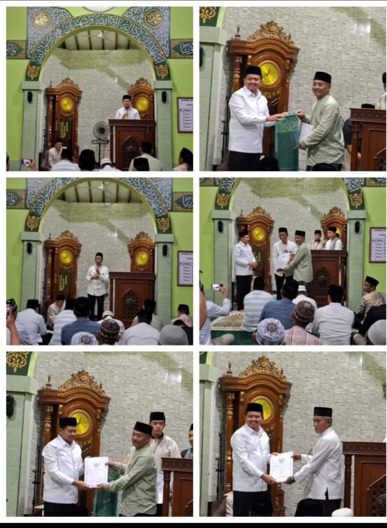 Dalam kesempatan tersebut, Bupati juga menyerahkan sejumlah bantuan secara simbolis kepada pengurus masjid serta dukungan bagi para guru ngaji yang diterima oleh kepala desa setempat.