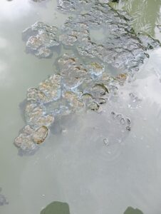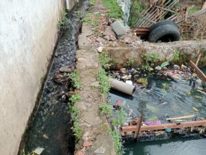 Dari hasil produksi Basreng menghasilkan limbah yang begitu sangat pekat ,yang di buang langsung ke sungai dan selokan yang masuk keberapa kolam ikan milik warga.